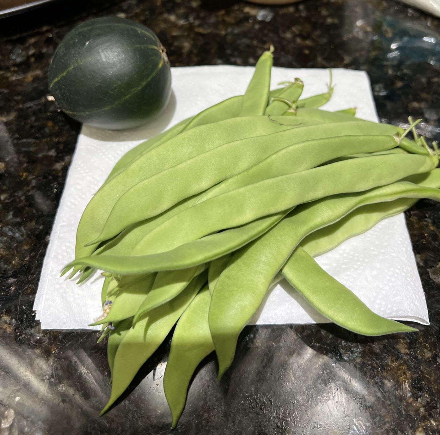 After telling you about my lackluster garden production last week, I have big news to report: A handful of green beans and a small, rescued 8-ball zucchini. I say “rescued” because the entire vine dried up and died, so I had to pick it early. Photographic evidence of my “haul,” above.