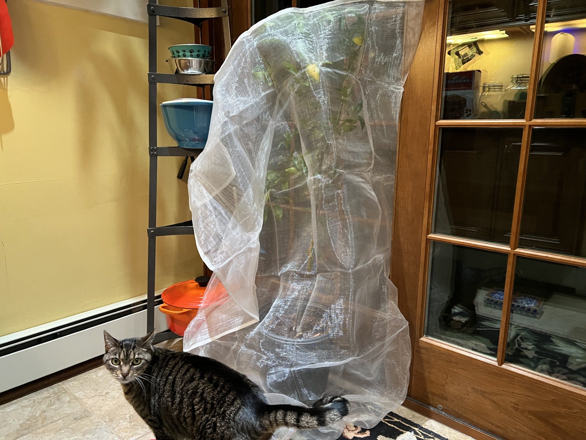 I brought my potted mandarin orange back indoors for the winter. I should have done it earlier, as some of its leaves were starting to yellow from the cooling temps, but since my daughter’s cat lives here now — and citrus plants are toxic to cats — I left it outside until I could figure out a way to protect both of them.